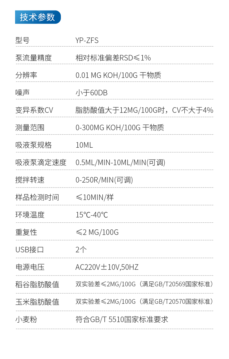全自動脂肪酸值測定儀是針對脂肪酸值作為判斷儲糧品質劣變的重要儀器設備,是一種以電極電位突躍作為指示終點為控制依據的自動滴定裝置。主要用于測定稻谷、糙米、大米等糧食作物的脂肪酸值,是一種專用檢測設備。本儀器實現了滴定終點判定、計量、數據處理、測定結果顯示及打印功能自動化,提高了檢測結果的客觀性及準確性,具有操作簡單、使用方便的特點。